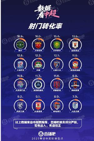 数据看中超|浙江领跑射门转化率 海港国安分列二三 大连英博垫底