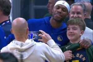 赛前发生有趣一幕,巴特勒不敢相信场边一个小孩儿竟然穿着希尔德的7号球衣,希尔德则抱着小孩儿抢着与后者合影。